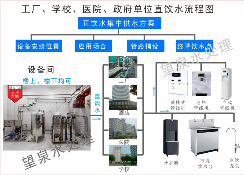 具 體 說 明 | 技術參數: 1)前三級罐體,第一級石英砂過濾器,第二級活性炭過濾器,第三級軟化過濾器,第四級精密過濾器,第五級是RO膜 注明:源水為自來水(不是地下水或水硬度不高時,第三級軟化過濾器可以不要) 2)過濾次序: 源水泵 砂濾器 碳濾器 軟水器 精濾保安濾器 RO反滲透主機 純水箱 (紫外線殺菌器 各個管線飲水機) 注明:臭氧殺菌器,紫外線殺菌器根據實際需要選擇。 前三級罐體材質:玻璃鋼 主機支架材質:304不銹鋼 產水運行可自動控制,維護時可手動 |